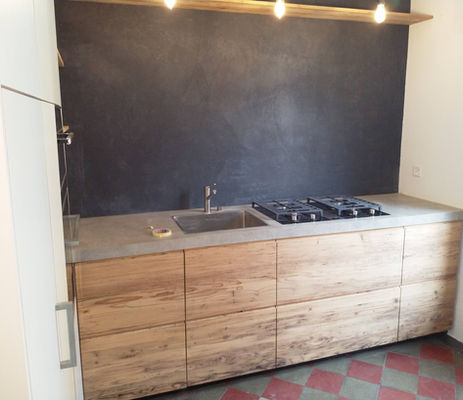 Abdeckung aus Imi-Beton mit Gas Bora Kochfeld und Dampfabzug. Fronten in Altholz Dreischicht Platte und Sperracolor weiss